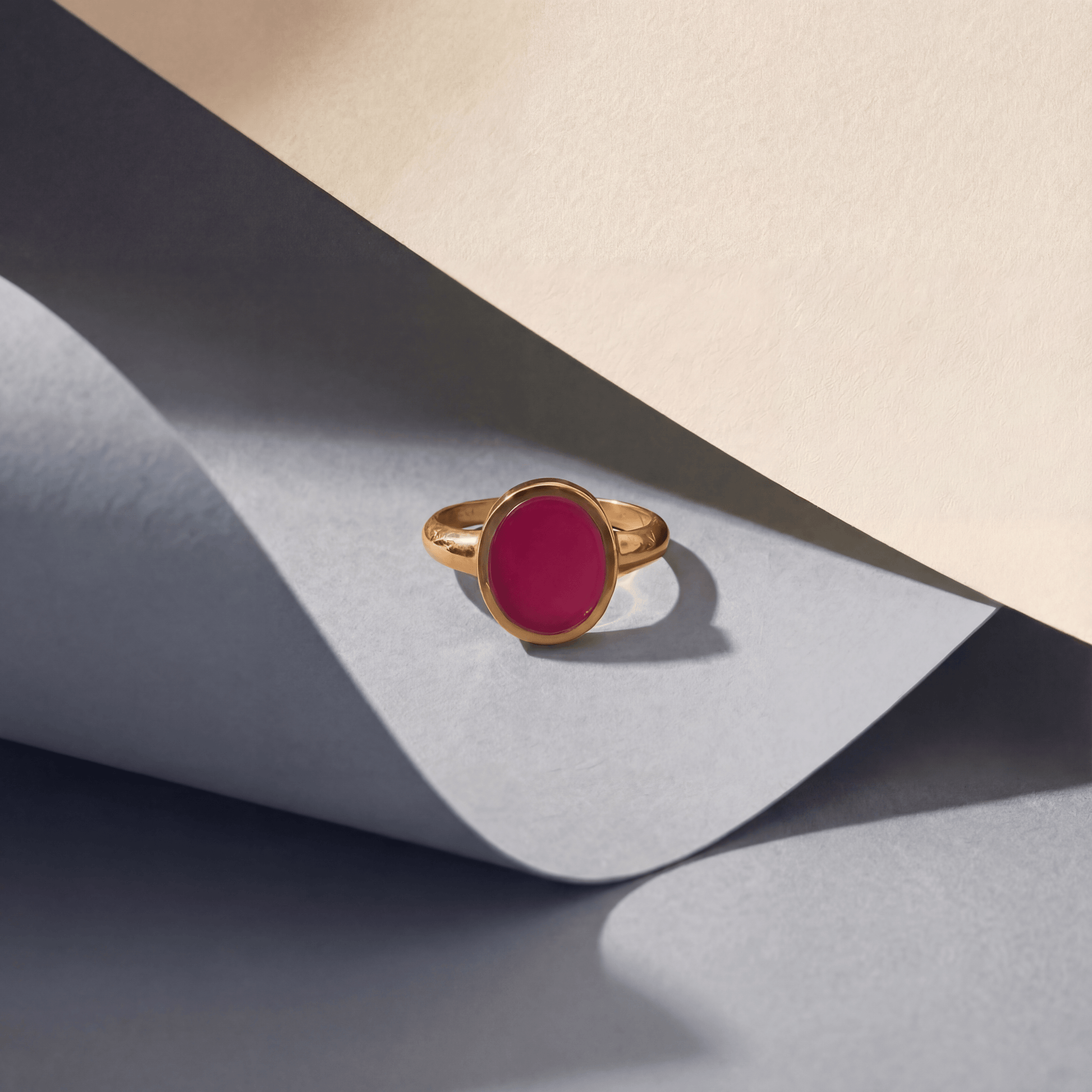 The SONO. A contemporary interpretation of the classic signet ring, this ring is crafted from 925 sterling silver and plated with 14-karat gold for a warm, refined sheen. At its center shines a deep red chalcedony , a stone symbolizing wisdom, peace, and strength.